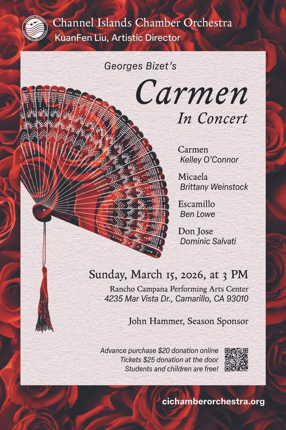 The CSUCI University Chorus will perform with Channel Islands Chamber Orchestra in Carmen in Concert, conducted by Dr. KuanFen Liu and featuring an exceptional cast of soloists—Kelley O’Connor, Brittany Weinstock, Ben Lowe, and Dominic Salvati.